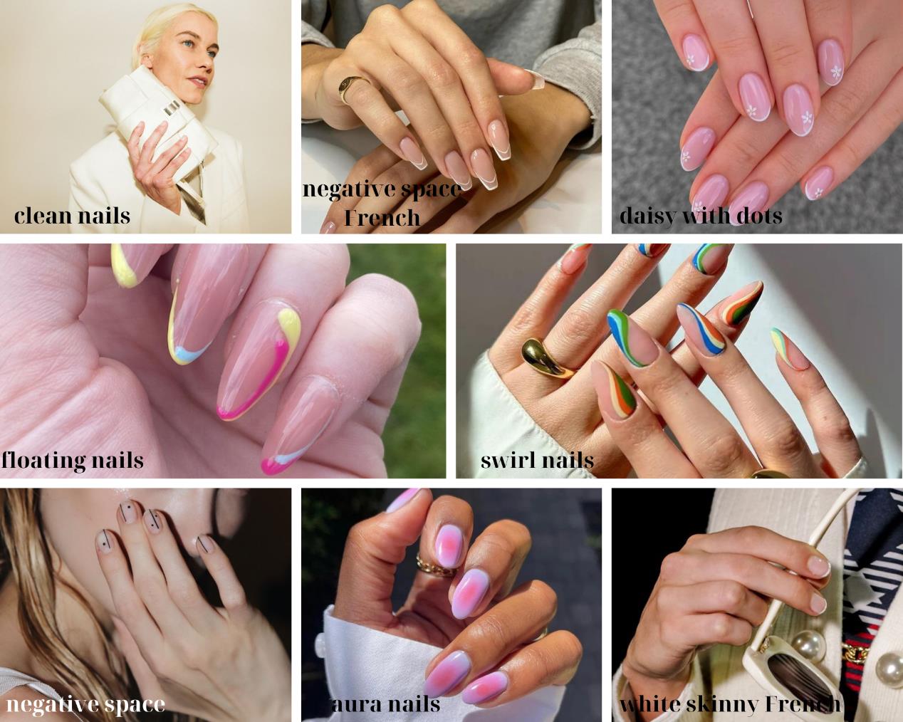 Ταυτόχρονα, εντυπωσιάζουν τα floral σχέδια με τη χρήση dots, όπως επίσης και οι γραμμές (floating French) και τα κυματιστά (swirl nails) σχέδια σε παστέλ αποχρώσεις. Επίσης, την εμφάνισή τους κάνουν τα mono-crystal nails καθώς και τα negative space nails.