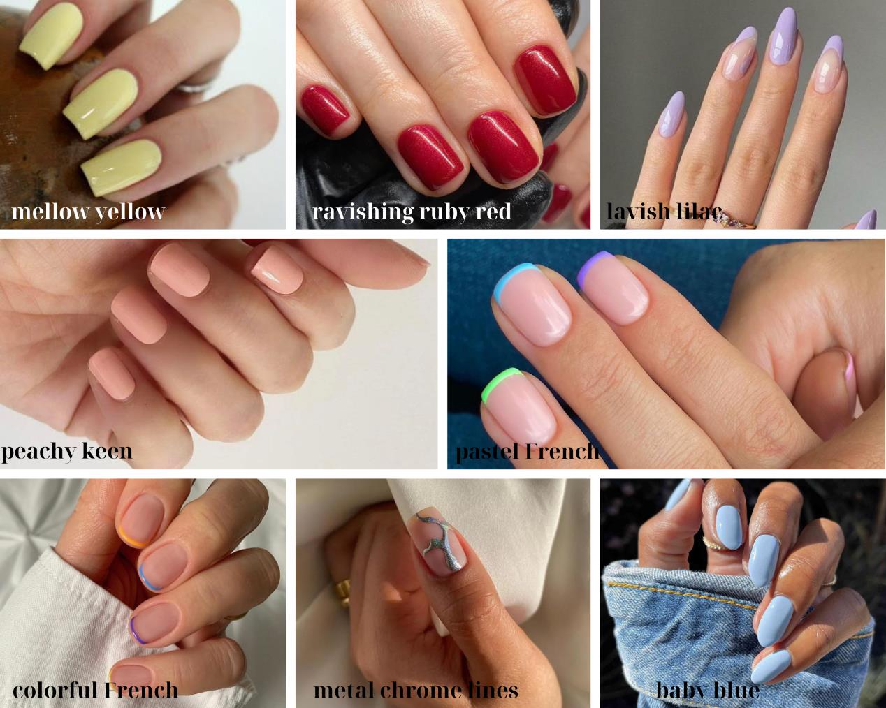 Στην επικαιρότητα βρίσκονται και τα aura nails, οι αφηρημένες μεταλλικές γραμμές και τα chrome nails, ενώ εντυπωσιάζει και το λευκό και κόκκινο skinny French.